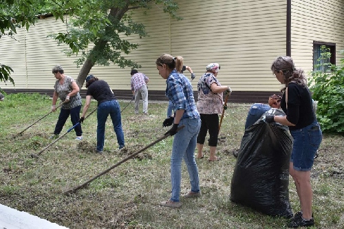 Работники районной администрации убирают территорию районного центра